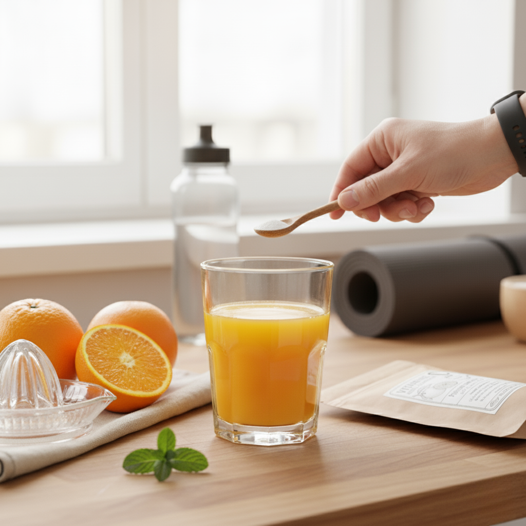 Mélangez votre poudre dans ce qui vous fait plaisir : un jus d'orange pressé le matin, une eau citronnée fraîche, une tisane tiède en soirée, ou tout simplement un grand verre d'eau. Vous choisissez selon vos envies du moment.