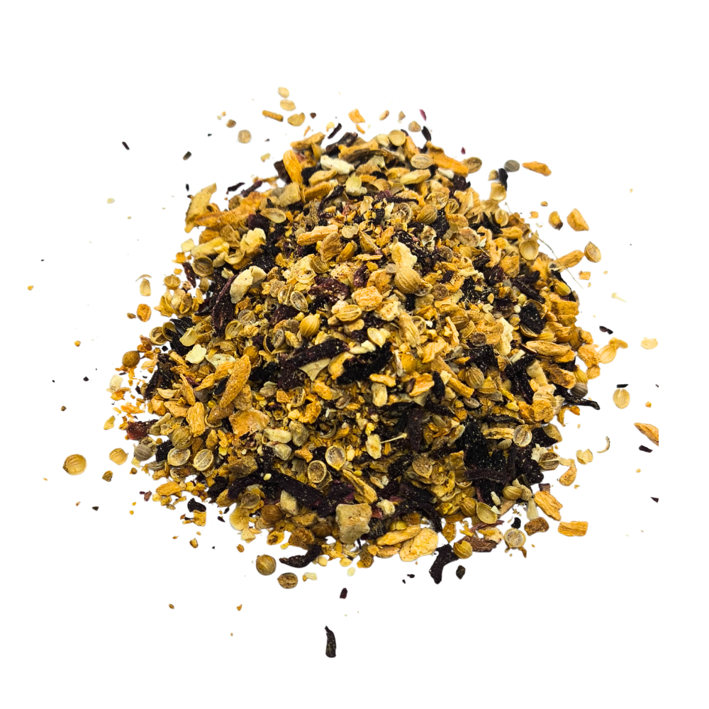 - Fleurs d'hibiscus (25 %), hibiscus sabdarifa) : Elles permettent de rééquilibrer une partie de l'aspect acido-basique de "l'encrassement" et facilitent le processus de digestion.