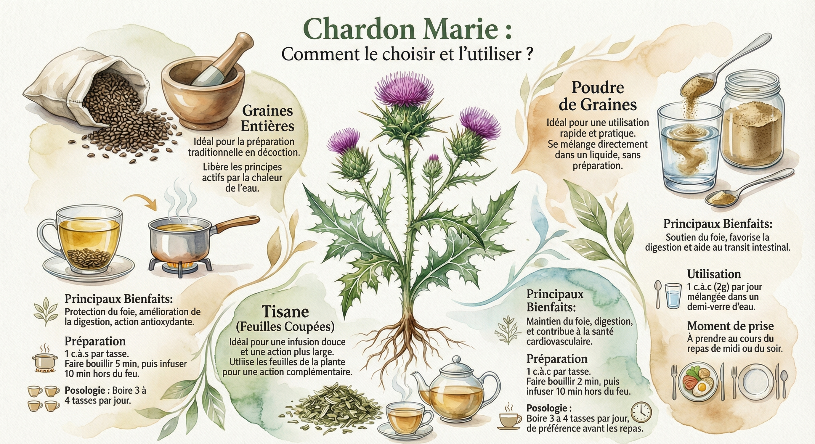 Le Chardon Marie est largement reconnu pour ses bienfaits, principalement liés au soutien du foie et du système digestif. Voici ses principales vertus :