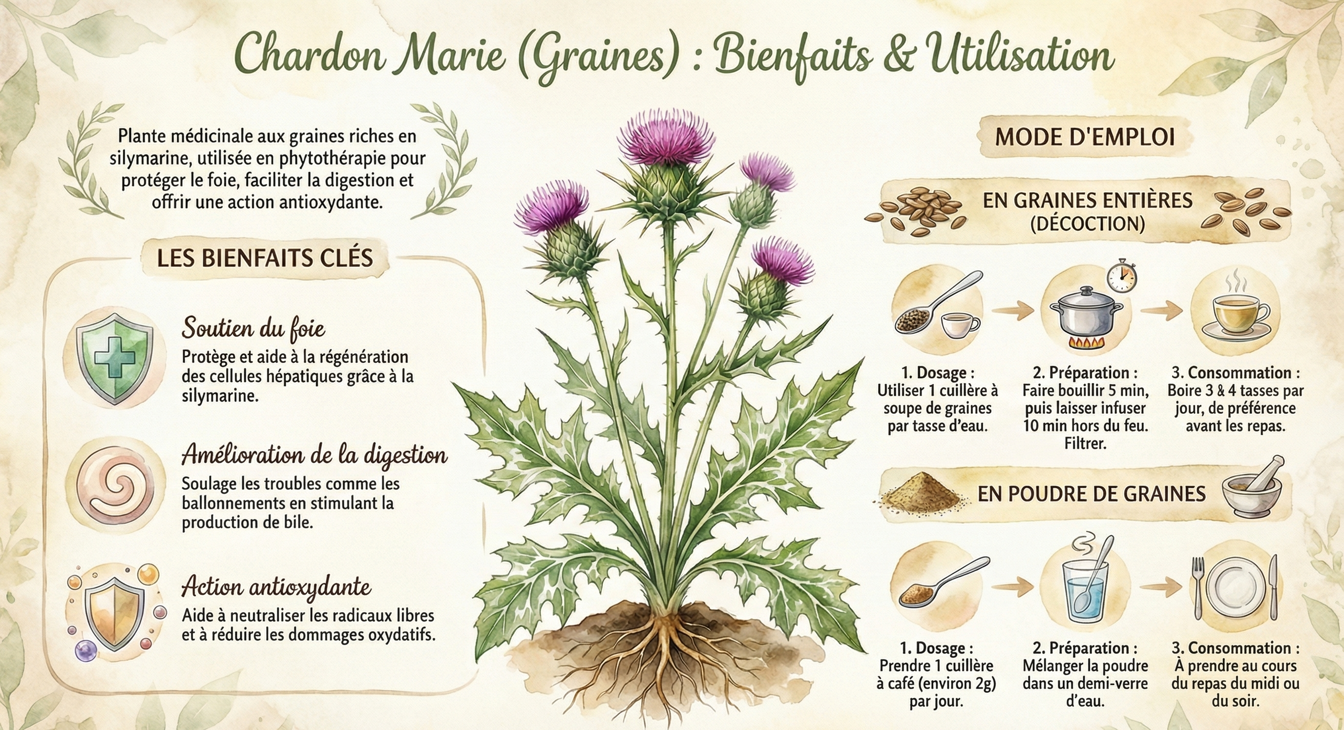 - Propriétés antioxydantes : Les flavonoïdes et la silymarine réduisent le stress oxydatif, protégeant les cellules contre les radicaux libres.