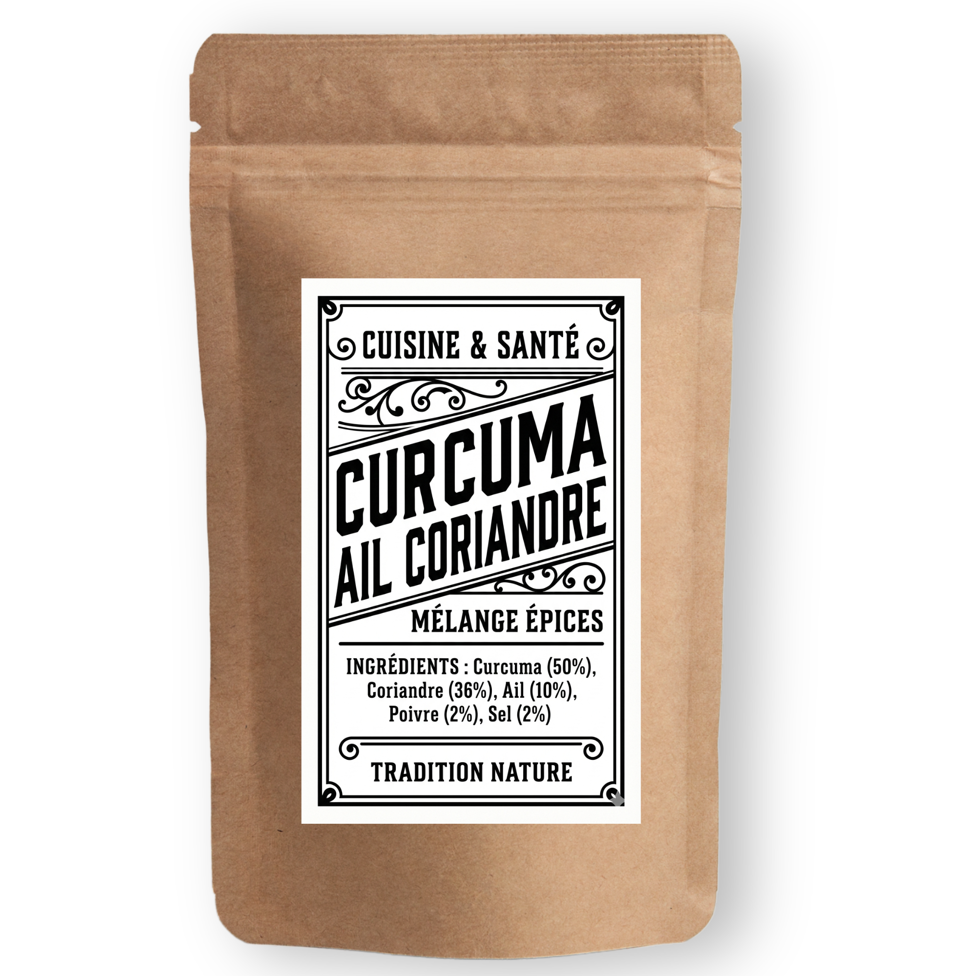 | Ingrédients | Curcuma (50%), Coriandre (36%), Ail (10%), Poivre (2%), Sel (2%) |