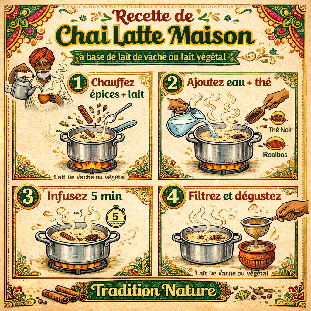 Portez le lait à ébullition 3 fois avec les épices pour obtenir une mousse onctueuse et libérer les huiles essentielles. Astuce : remuez doucement pour éviter que ça déborde ..., et laissez infuser quelques minutes pour intensifier les arômes.