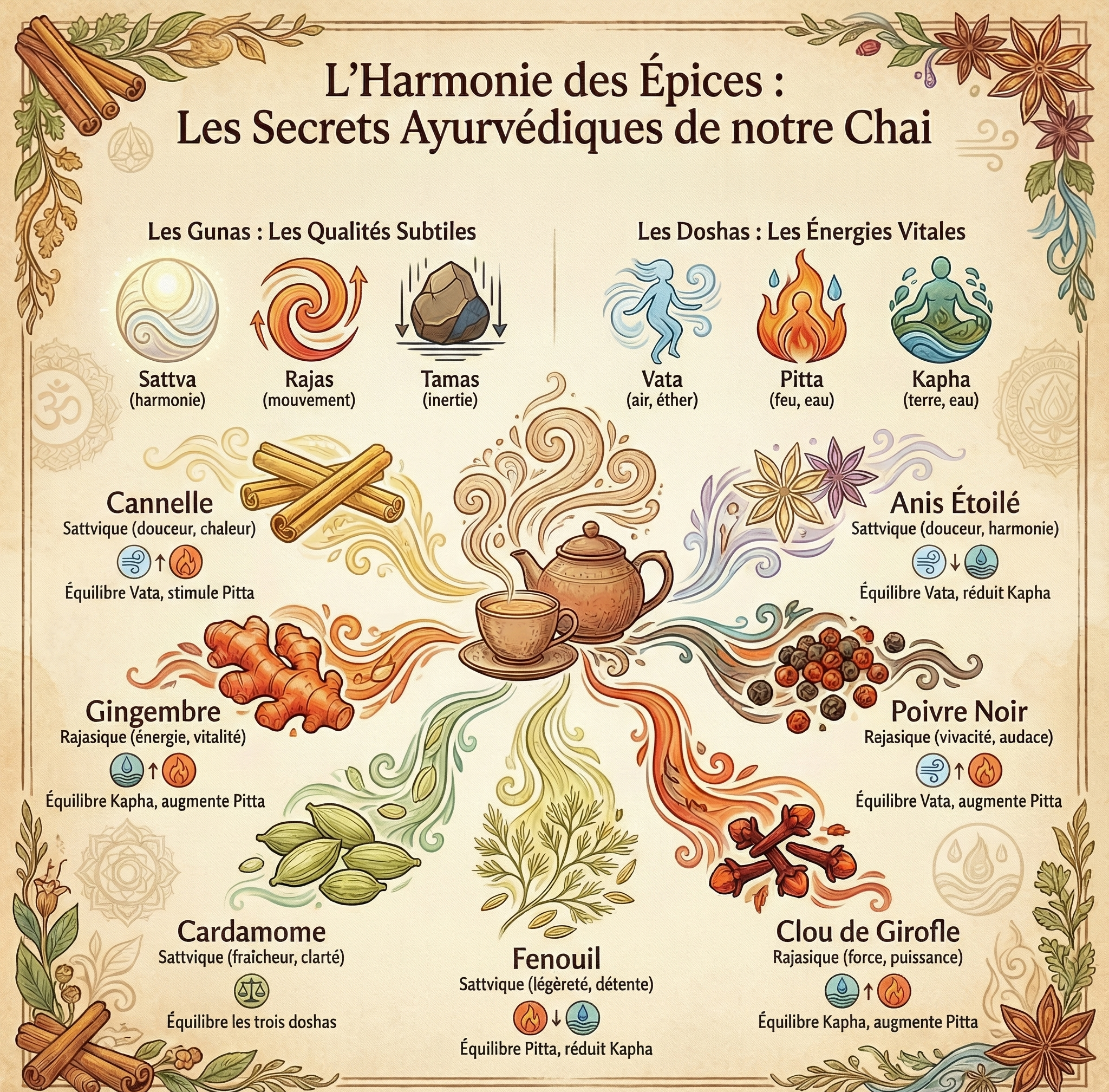 Voici les guna et les doshas des épices du tchai masala Tradition Nature :