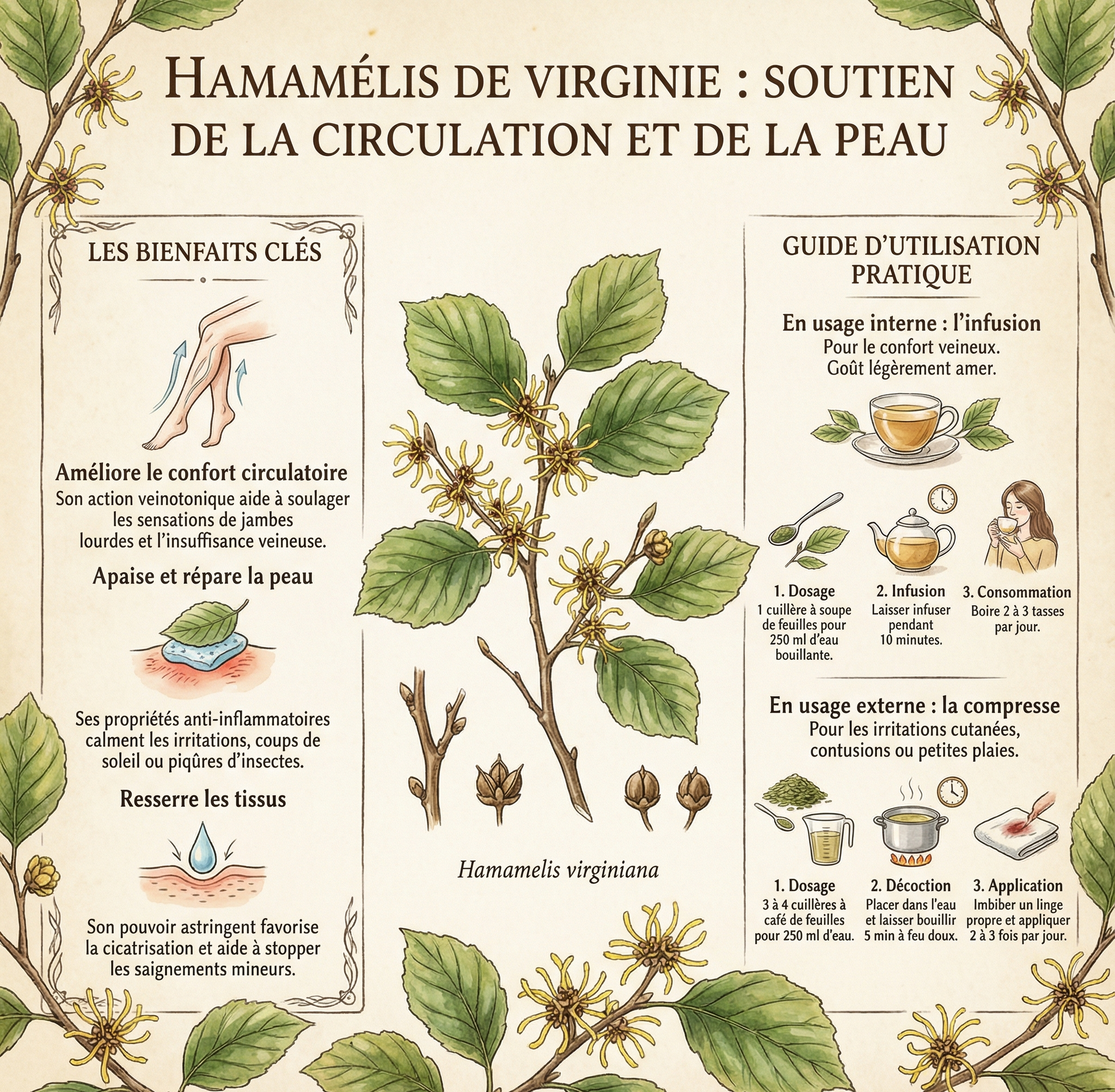 Les tanins et flavonoïdes de l'hamamélis exercent une action veinotonique en augmentant le tonus veineux et en renforçant la paroi des vaisseaux sanguins. Cela en fait un remède traditionnel pour l'insuffisance veineuse, les jambes lourdes, les varices et les hémorroïdes. Son activité vasculoprotectrice contribue également à la santé cardiovasculaire.