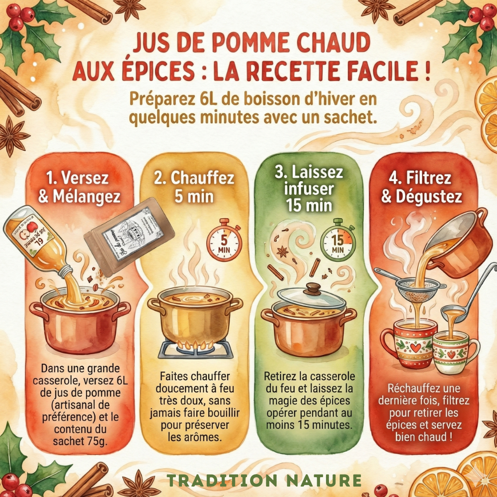 Le mélange d'épices pour jus de pomme chaud est maintenant disponible en 200 g pour 15 L de jus de pomme !