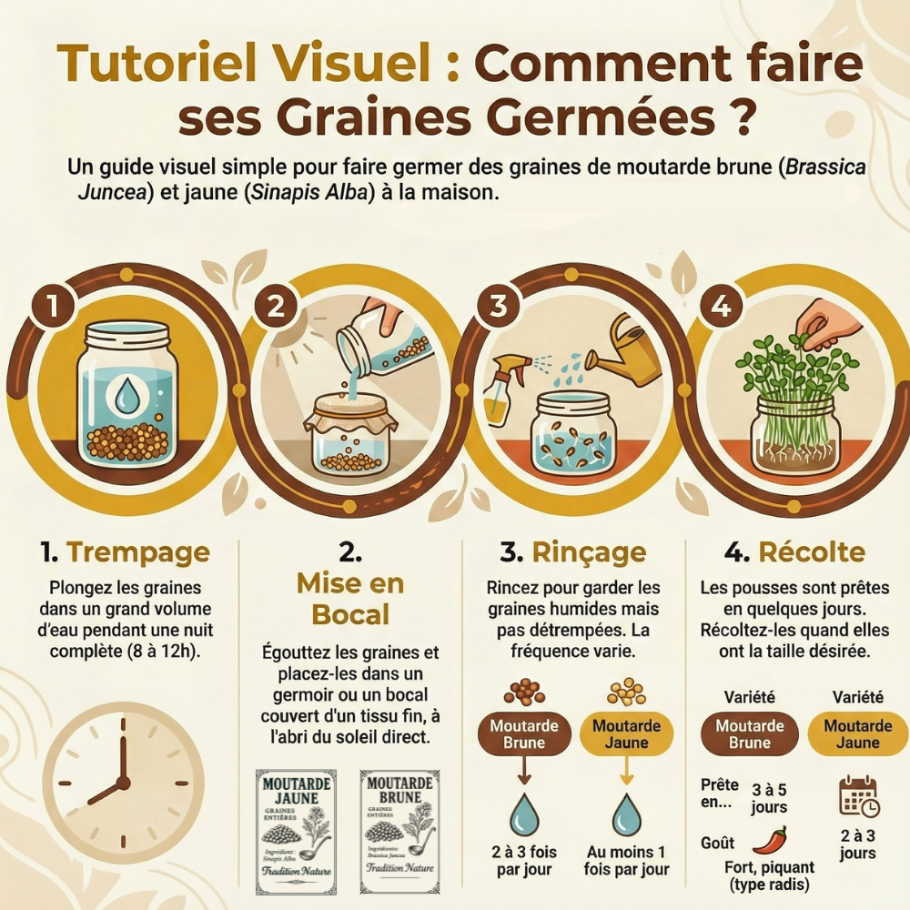 - Laisser germer : Gardez le bocal à température ambiante, à l'abri de la lumière directe du soleil. Les graines de moutarde brune devraient commencer à germer en 3 à 5 jours.