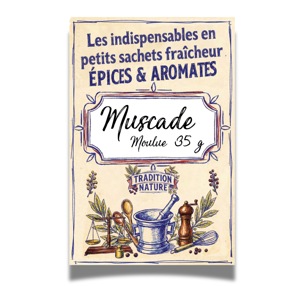 Notre muscade moulue est 100 % Myristica fragrans, finement broyée pour une diffusion rapide des arômes.