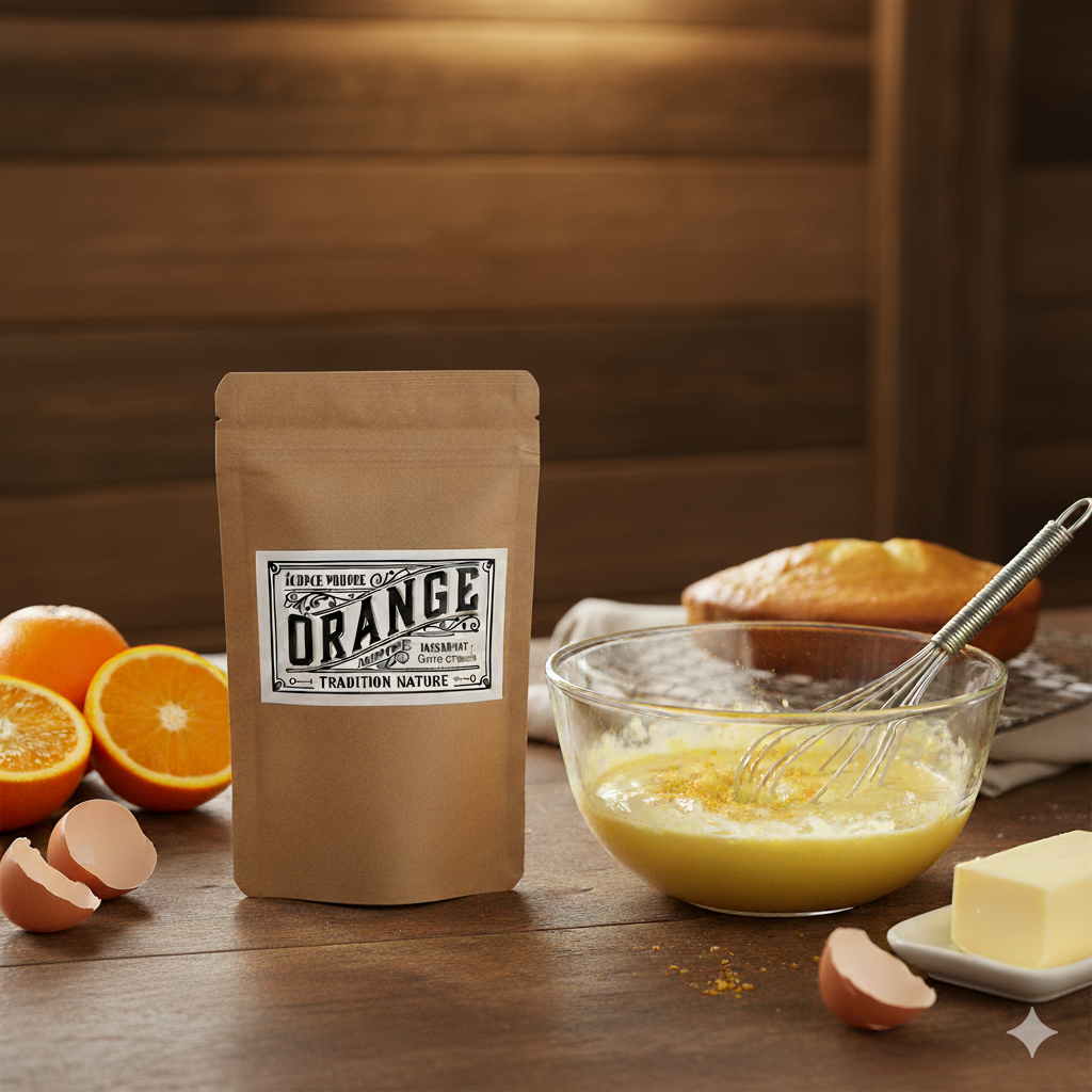 1. **Pâtisseries et desserts** : La poudre d'orange peut être incorporée dans des muffins, des gâteaux, des crêpes et des biscuits pour apporter une note d'agrume. Elle se marie particulièrement bien avec le chocolat.
