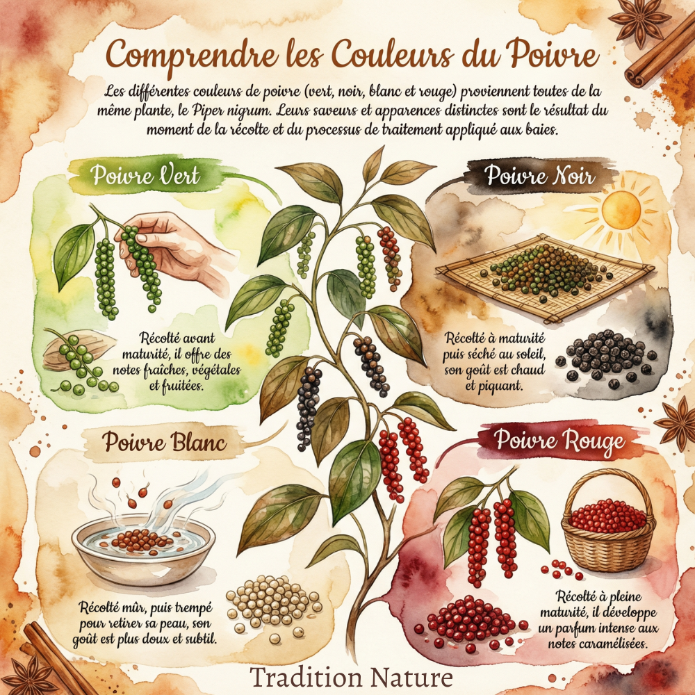 L'espèce Piper nigrum produit, selon le stade de sa récolte , le poivre vert, blanc ou noir.
