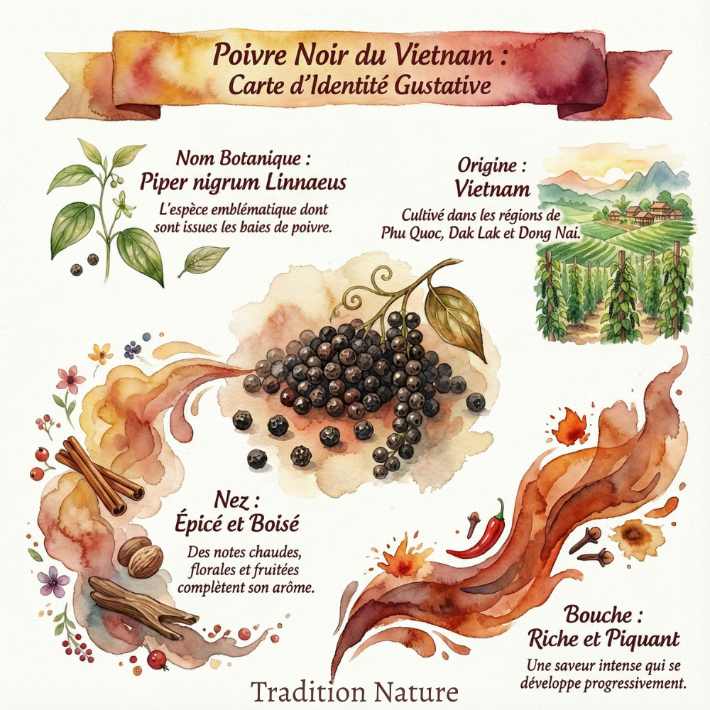 Le poivre noir du Vietnam, scientifiquement connu sous le nom de Piper nigrum Linnaeus, est une épice emblématique originaire des régions tropicales du sud-est asiatique.