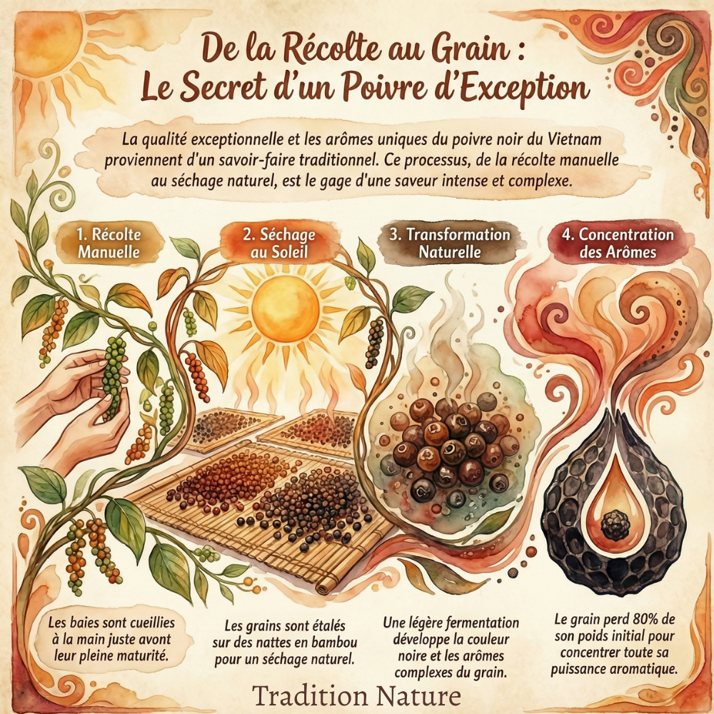 Les baies de poivre noir vietnamien sont récoltées à la main juste avant leur pleine maturité, lorsqu'elles commencent à passer du vert au jaune. Elles sont ensuite soigneusement triées, lavées et séchées au soleil pendant plusieurs jours sur des nattes en bambou.