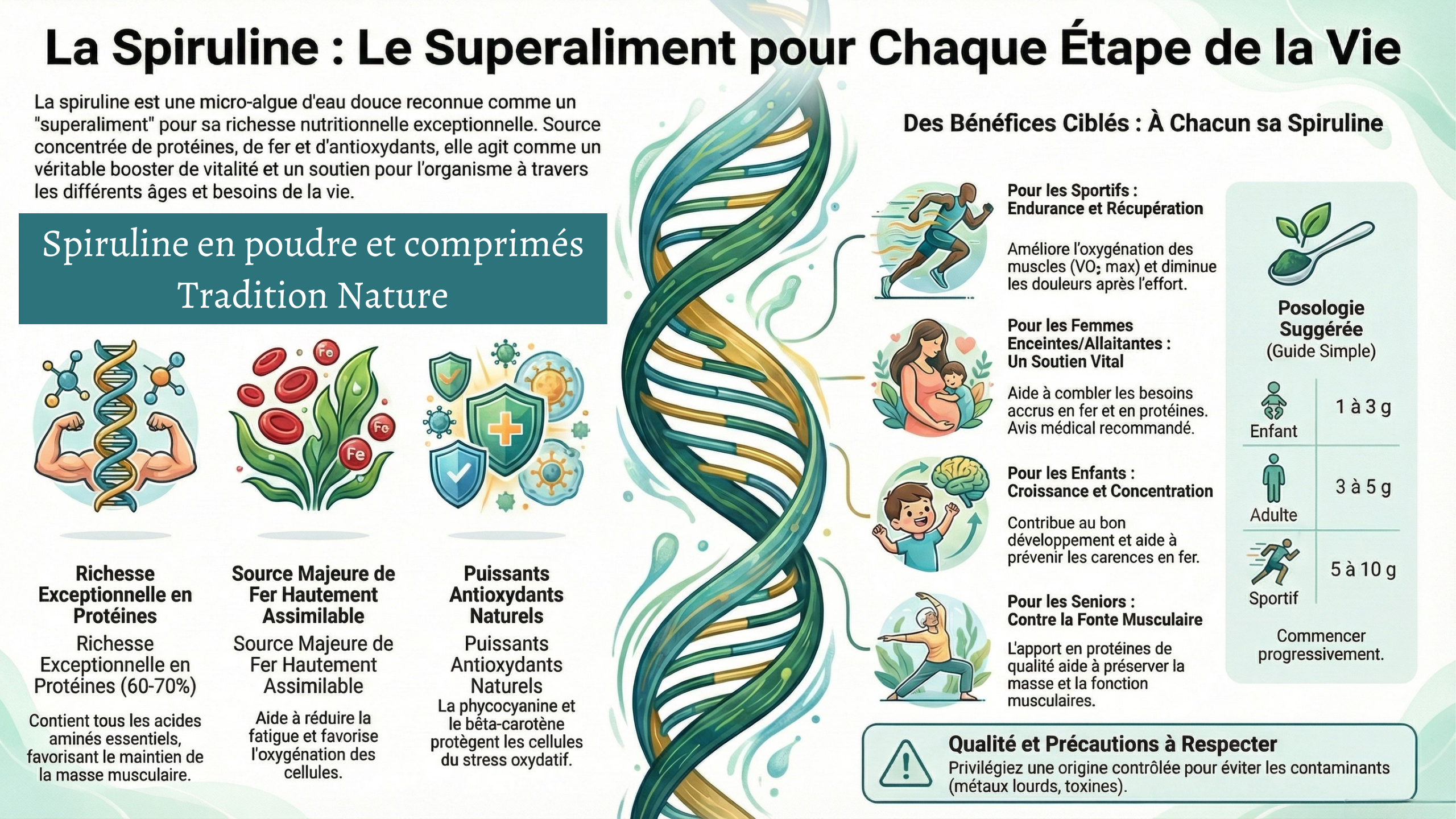 Enfin, la spiruline aide à combattre la fatigue saisonnière en soutenant l’organisme face au manque de lumière, souvent responsable de baisses d’énergie et de moral en hiver. Son apport en vitamines E et A, ainsi que ses effets sur l’amélioration de l'oxygénation cellulaire, offrent un soutien pour maintenir un niveau d’énergie suffisant et affronter l’hiver de manière plus équilibrée.