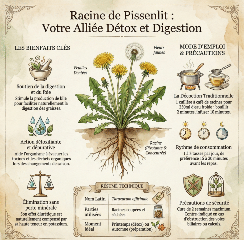 L’Agence Européenne du Médicament recommande de limiter l’usage à 2 semaines consécutives maximum. Femmes enceintes, allaitantes et enfants de moins de 12 ans ne doivent pas consommer de tisane de pissenlit sans avis médical. Surveillez l’apparition de brûlures d’estomac, nausées ou douleurs abdominales et cessez immédiatement la consommation en cas de réaction indésirable.