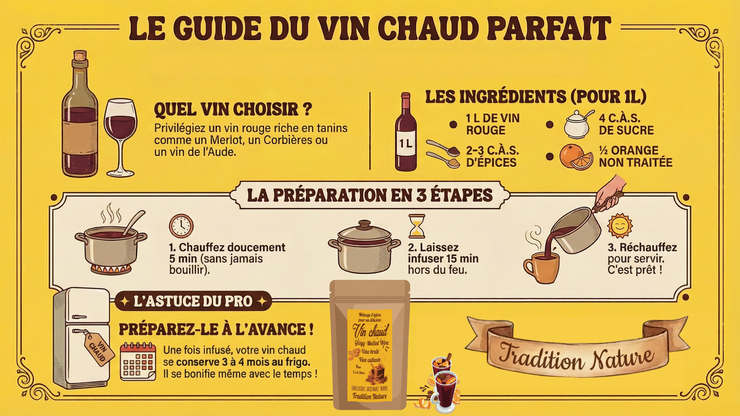Les épices qui servent à élaborer votre délicieux vin chaud, permettent aussi une meilleure conservation de votre vin. Une fois infusé, votre vin chaud se conserve 3 à 4 mois au frigo. Il a même tendance à se bonifier comme c'est le cas pour notre apéritif aux épices l'Hypocras.